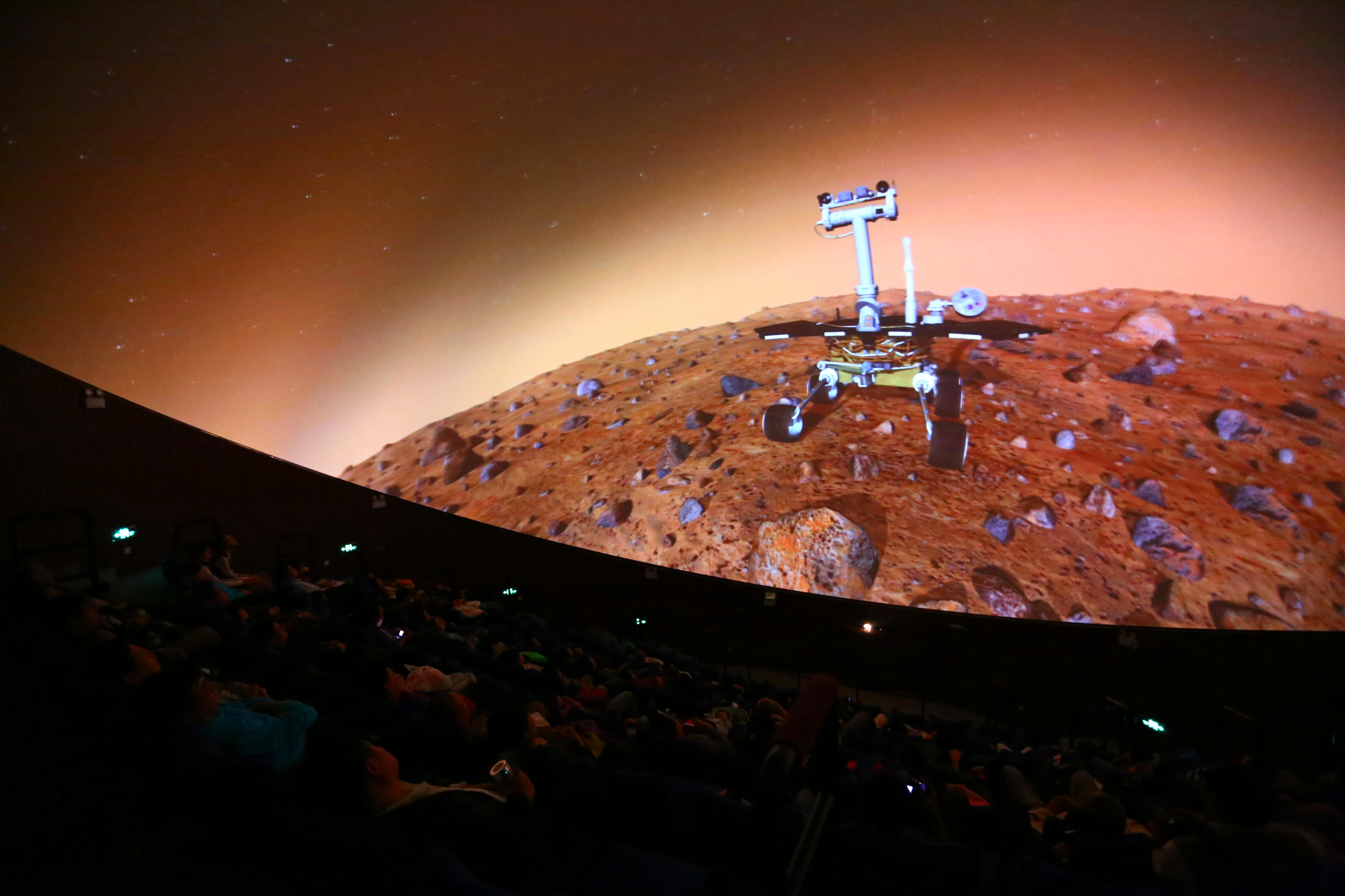 我馆“穹幕影院”内径为16米,有150个座位, 2台数字投影机拼接融合投射至全域穹幕,视域范围高达360°, 综合光通量20000流明以上,采用国际知名品牌的无缝拼接金属银幕,7.1声道立体声环音系统,并可作为数字天象仪演示±100万年的星象变化,是目前国内配置一流的数字穹幕影院。